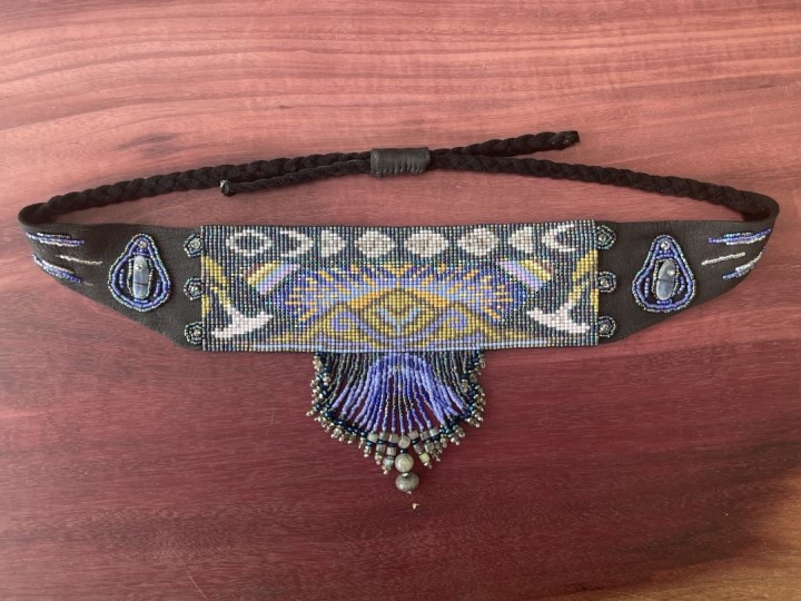 materials: glass seed beads, deerskin leather, labradorite, blue kyanite