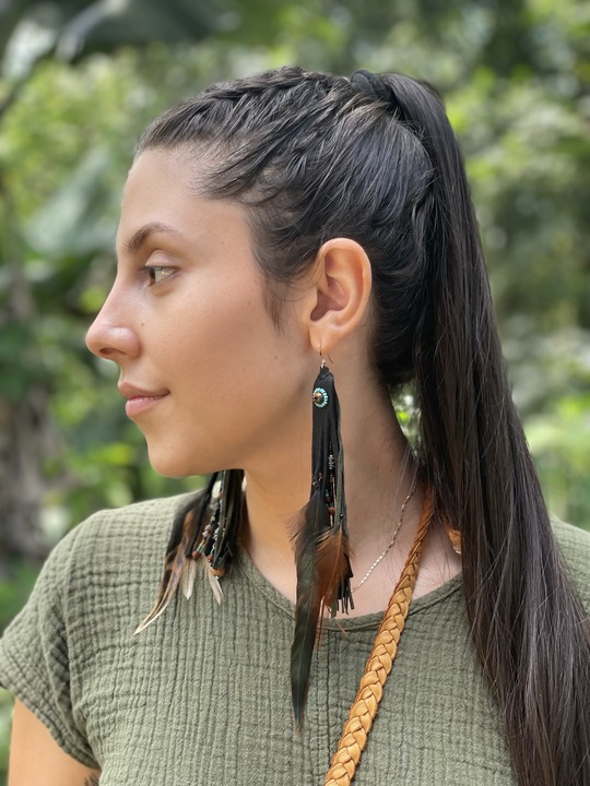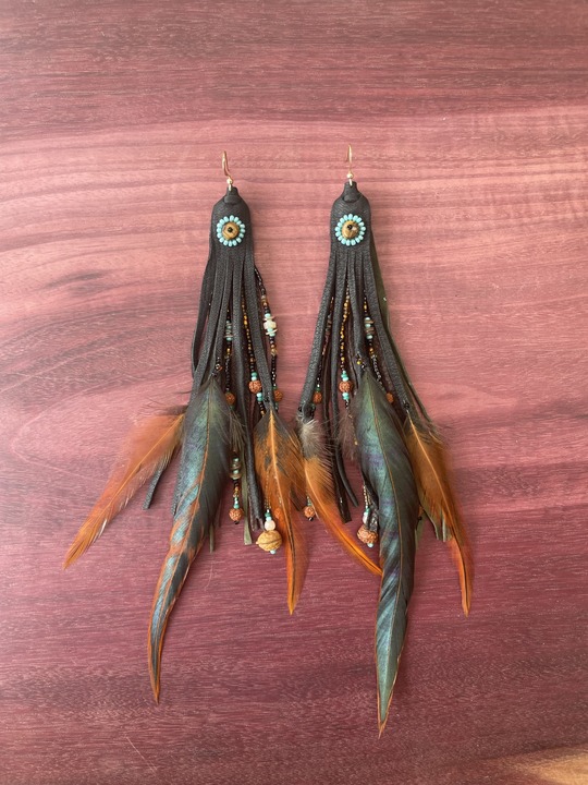 materials: deerskin leather, suede, tigers eye, shell, bodhi seeds, moonstone, rooster feathers, glass seed beads, gold filled findings