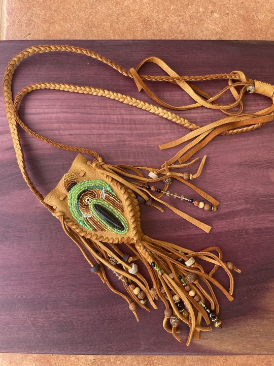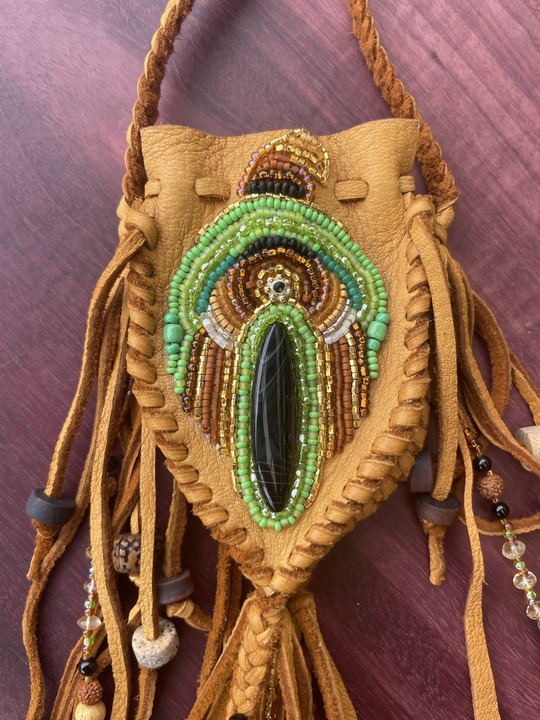 materials: deerskin leather, black agate, glass seed beads, bodhi seeds, jasper, tigers eye, black onyx, palo santo, rabbit fur